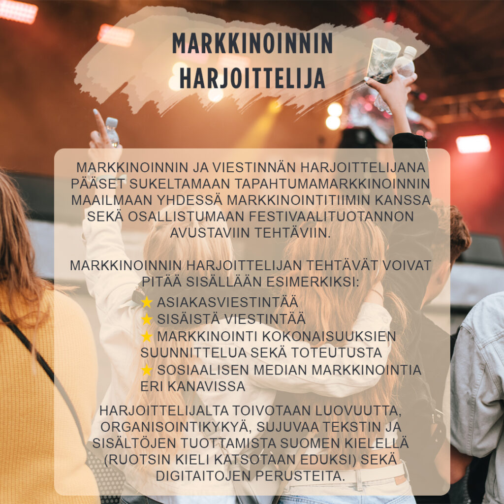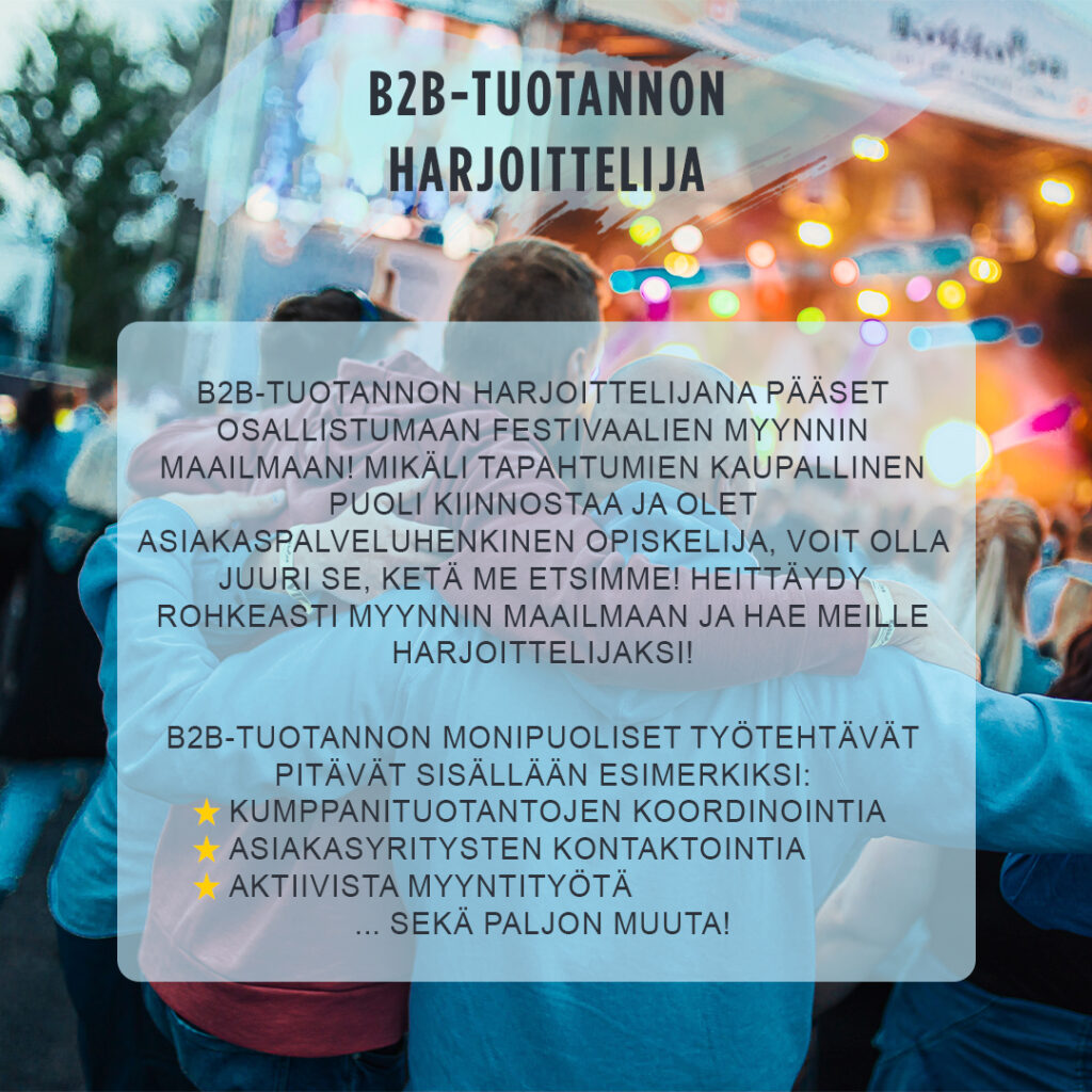 Oletko rohkea ja positiivinen supertyyppi, joka rakastaa musiikkia, elämyksellisyyttä ja tapahtumia? Sinulla on nyt mahdollisuus suorittaa elämäsi upein työharjoittelu tulevan kesän parhaassa festarituotannossa osana meidän tiimiä!