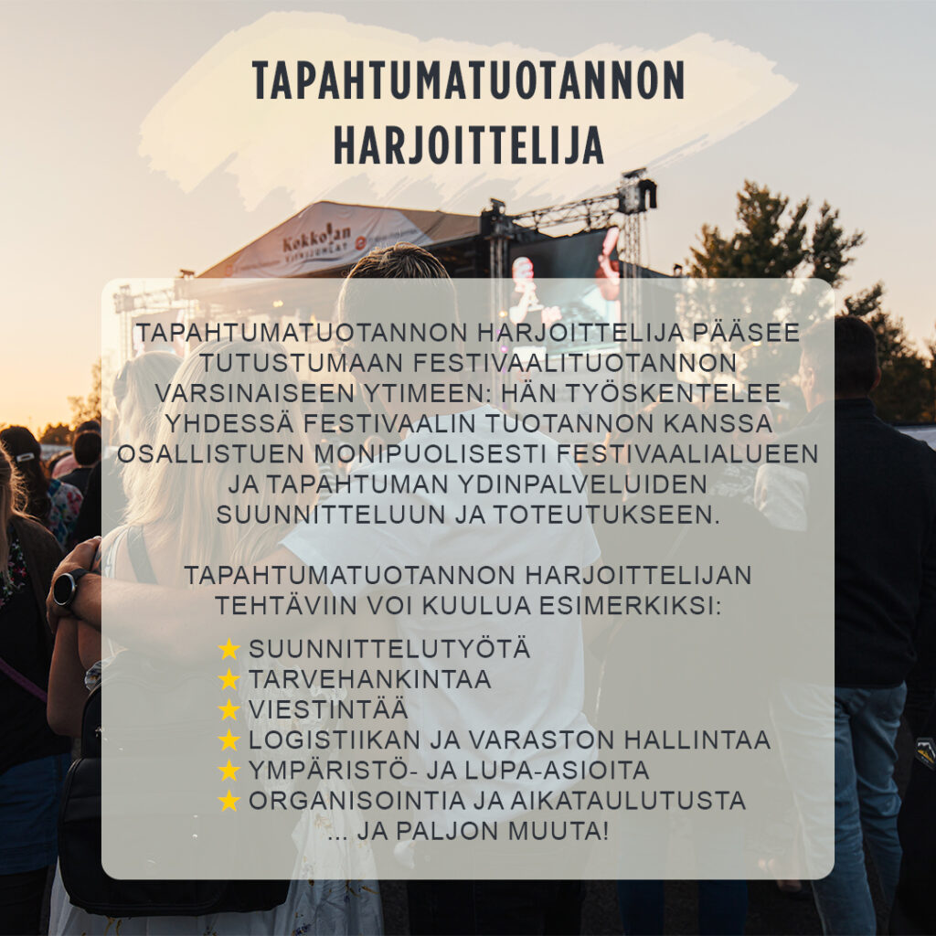 Kattavan opin tapahtumatyöskentelyn eri osa-alueista keskittyen pääsääntöisesti tietysti oman harjoittelusi osa-alueesi. Tarjoamme kattavan perehdytyksen työtehtäviin sekä työskentelyä upeiden erilaisten tapahtumien parissa mukavassa ja rennossa työyhteisössä.
